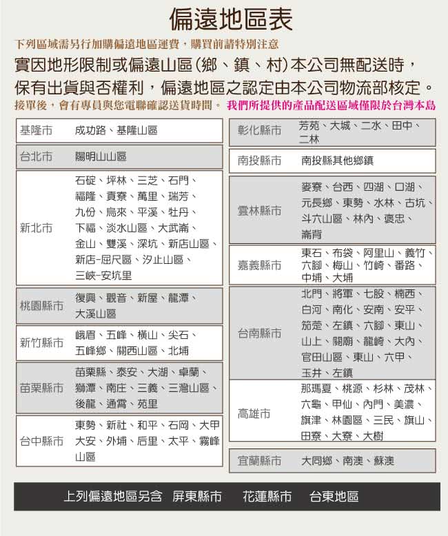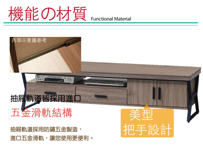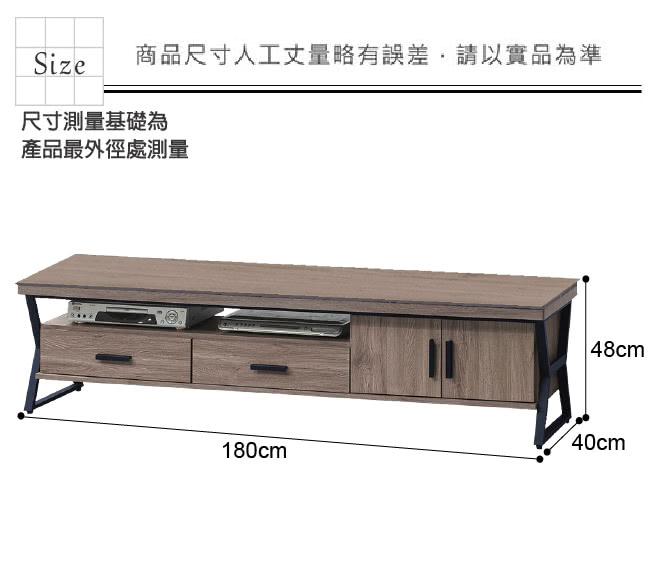 產品名稱:【綠活居】亞迪卡 現代風6尺二門二抽電視櫃/視聽櫃 產品尺寸: 電視櫃:(寬)180x(深)40x(高)48/ 公分 材質:防蛀木心板+黑鐵砂腳座 材質:五金滑軌結構 塗漆:優利坦耐磨三層全包式塗漆塗裝處理 ◎注意事項: 1.接單後,會有專員與您電聯確認送貨時間。 2.需以吊車吊運以當地吊車行情計,費用由消費者支付。 3.備註:本商品不含圖片上、家飾...等,情境圖之內容僅供參考。 4.請於配送人員到場時,檢查商品有無缺失,以免造成爭議。 5.允許的誤差尺寸範圍+-2%。 6.因拍攝燈光與電腦解析度瑩幕不同可能會造成實品與網頁上商品有些許色差,商品以收到實品為主。 ◎收貨與退貨: 1.實因特殊地型限制及(山區、濱海鄉、鎮、村、區)無法送貨時,本公司保有出貨與否之權利(下單後會由專人告知是否可配送)。 2.有電梯不收取費用! 無電梯樓層超過4樓以上(包含4樓)一樓層費用200元,現場支付給服務員。 3.超過鑑賞期,恕不接受退貨。 4.限非人為因素破壞毀損,才可退貨。 5.若退貨時,收件時間請與廠商協調,確保自己權益。 6.退貨時應保留贈品及附件完整(如有遺失部分,需酌收費用)。 ◎備註: .無回收服務。 .收貨與退貨:實因特殊地型限制及(山區、濱海鄉、鎮、村、區)無法送貨時,本公司保有出貨與否之權利(下單後會由專人告知是否可配送)。 .花蓮(縣市)、台東(縣市)、屏東(縣市場及其它縣市屬於山區、濱海鄉、鎮、村地區無配送服務,如您有需求,則需另外收取運費。(您可直接訂購,後續由廠商報價。) ※由於加價配送服務為一次消耗性商品,若有退換貨等情形加購之運費恕無法退還 ※運費報價皆為單趟計算。 ※使用加價配送地區,收貨時間會比一般地區再增加10個工作天。